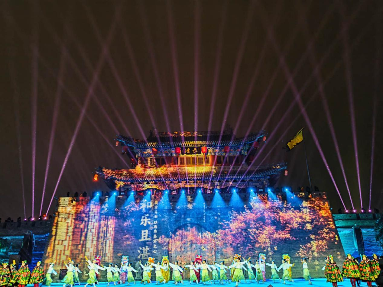 “夜赏黎阳城”行浸式体验以古城为舞台,沿途进行高跷、竹马、鼓舞等热闹的社火巡游,观众可以体验到移步换景、古今交融的行浸式观演感受。